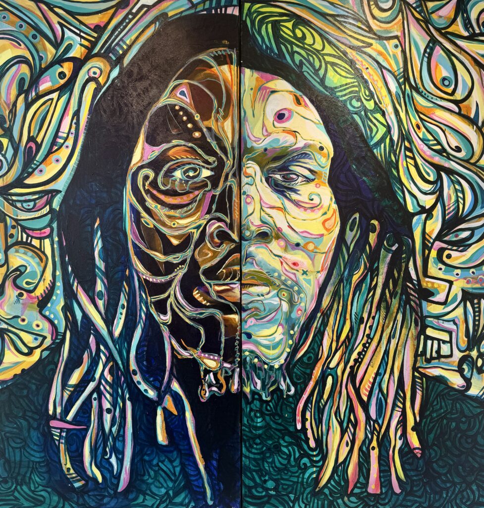 One piece presents a split portrait, half rendered in dark, skeletal tones and the other in luminous, flowing colors. The two halves do not oppose one another as much as they converse, suggesting the coexistence of shadow and vitality, suffering and renewal. The swirling lines around the face blur the boundary between figure and environment, creating the sense of a psychological landscape.