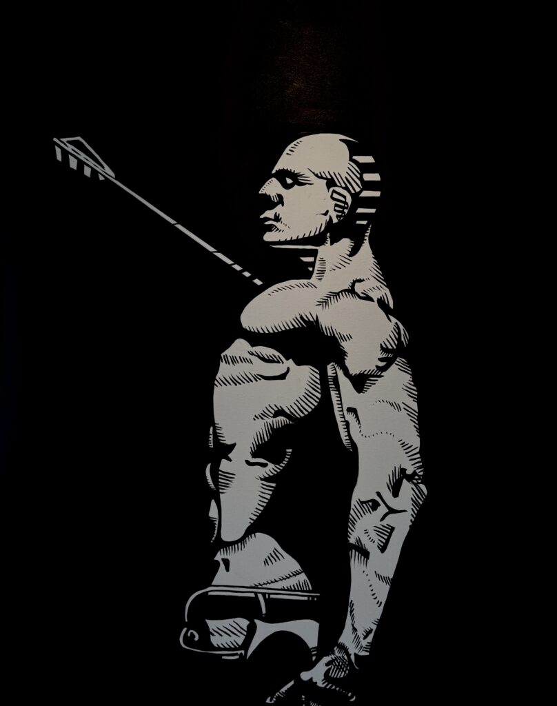 Another work takes a more minimal approach. Against a stark black background, a muscular figure stands tall despite being pierced by an arrow. His chin is lifted, his posture unbroken. The arrow, which could symbolize defeat, instead becomes a testament to resilience. Stripped to black and white, the image feels almost mythic, reminding the viewer that suffering is unavoidable but dignity can remain intact.