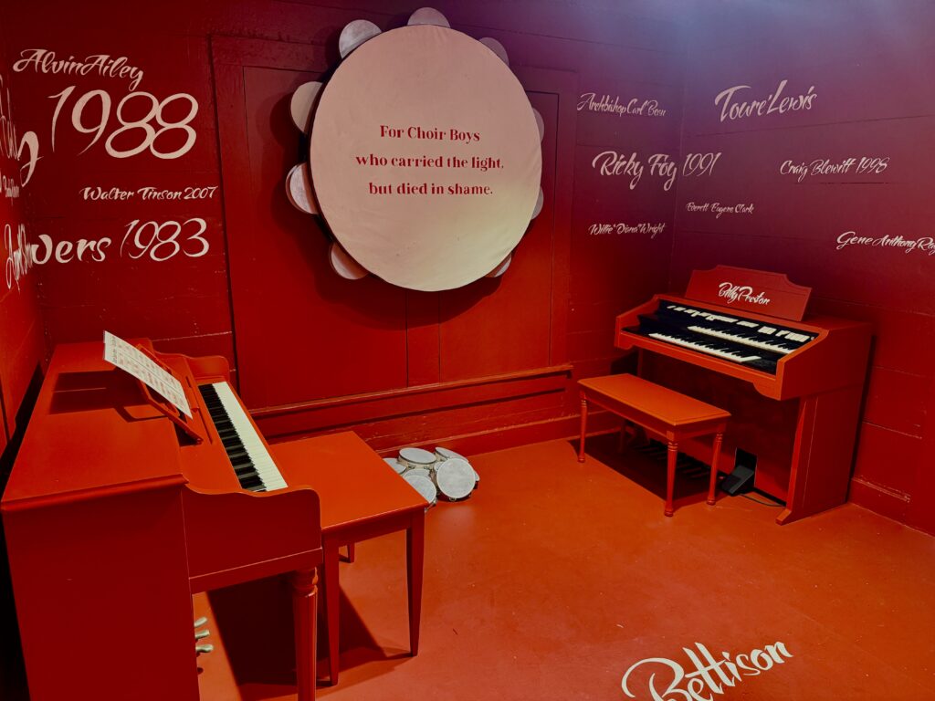One of the exhibitions, Harrison Guy’s, “For Choirboys, Church Queens, and Those Whose Sundays Stopped Too Soon,” is a standout installation that confronts truths that the Black church has often refused to speak aloud. It is a sanctuary for men who carried the weight of worship on their backs while hiding the most vulnerable parts of themselves.
