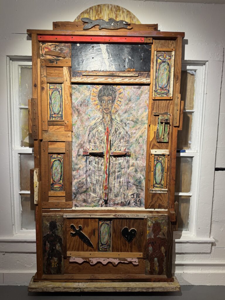 At the heart of the show is an original altar-style piece by James Bettison, one of the founders of Project Row Houses. The work pulls you in with its rough wood, layered panels, and a central figure surrounded by a halo. The cross is hand-painted and imperfect in a way that feels real. It reflects a life shaped by talent, rejection, faith, and survival. Bettison created altars because many churches refused to give him one. His work fills the silence that surrounded men like him.