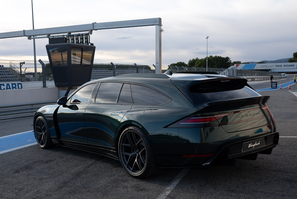 The rear end replaces the sedan’s trunk with a tailgate housing a sharply raked rear window framed by two spoilers. A performance-inspired rear diffuser structure completes the look.
