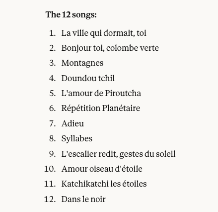 One song that stood out was “Répétition Planétaire,” where Bullock’s voice seemed to echo across vast distances, evoking both cosmic loneliness and the cycles of planets. It was haunting and beautiful. Across the entire cycle, from “La ville qui dormait, toi” through pieces like “Doundou tchil” and “Syllabes,” which rely on invented syllables, to the closing “Dans le noir,” she committed fully to each emotion.